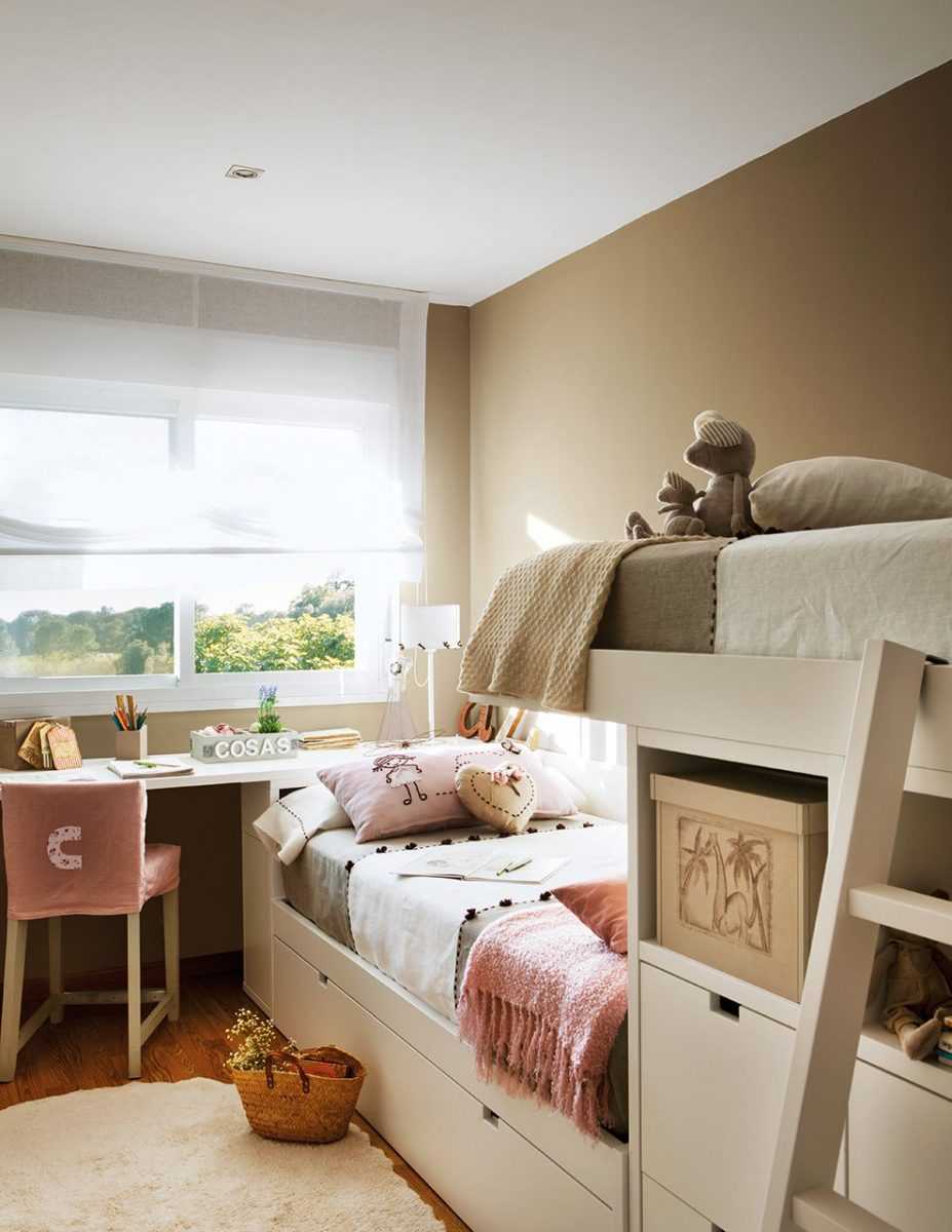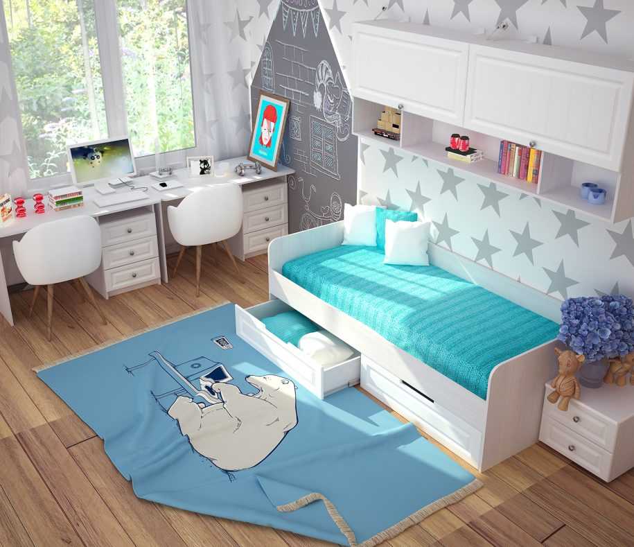 Детская для двоих детей разного возраста должна учитывать их различные потребности. Для старшего ребенка необходима большая потребность в личном пространстве, возможность хранить собственные вещи (одежда, книжные полки, шкаф, стол для учебы с компьютером и пр.)