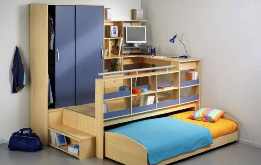 В просторном помещении меблировка не вызовет затруднений, но как сэкономить драгоценную площадь в малогабаритной детской? Выручит кровать-чердак либо кровать-подиум. Последняя ненамного выше стандартной модели, но имеет вместительные ящики для белья или личных вещей. Также в продаже имеются кровати-трансформеры с прочным механизмом, где еще одно спальное место прячется в выдвижной части.