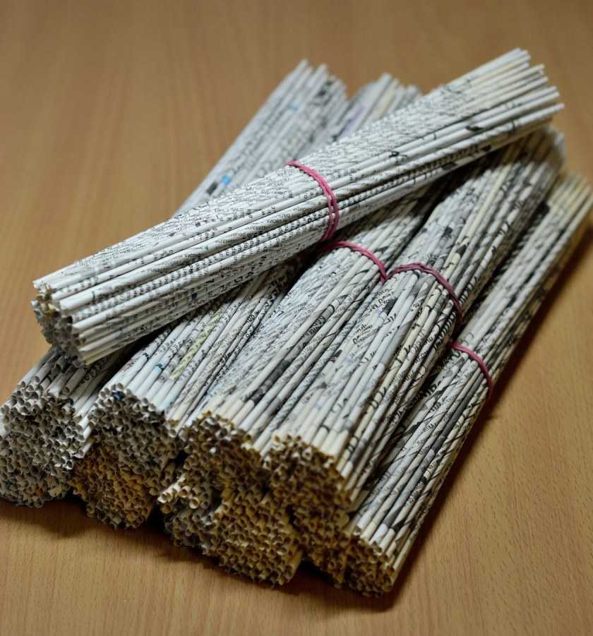 Её тоже достаточно легко сделать новичку. Для небольших ручек нужно взять пучок из 5-7 трубочек, в одну из них можно вставить проволоку. Далее их нужно уложить, переплетая веревочкой и постепенно скручивая.