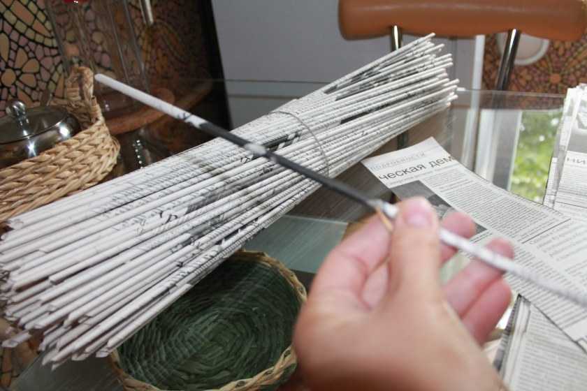 Кладем спицу под небольшим углом и придерживаем левой рукой газету, а правой рукой плотно скручиваем трубочки из газеты.