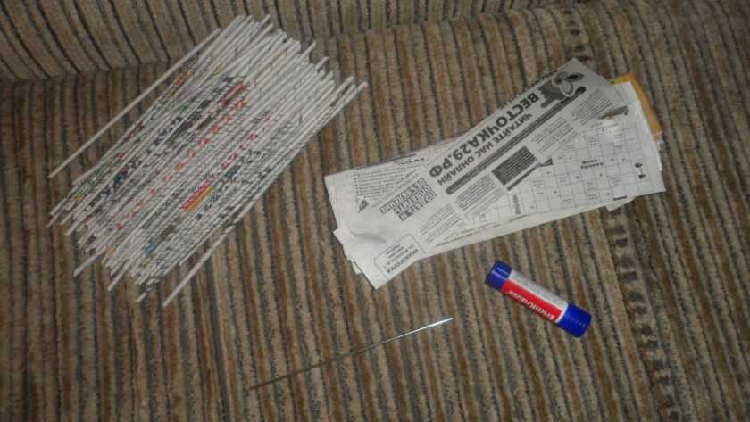 Для дальнейшей работы вам понадобится спица или проволока. Обверните одну полоску газеты в эту спицу немного по диагонали, предварительно склеив края ПВА. Так у вас получится первая трубочка, сделайте так ещё пару десятков.