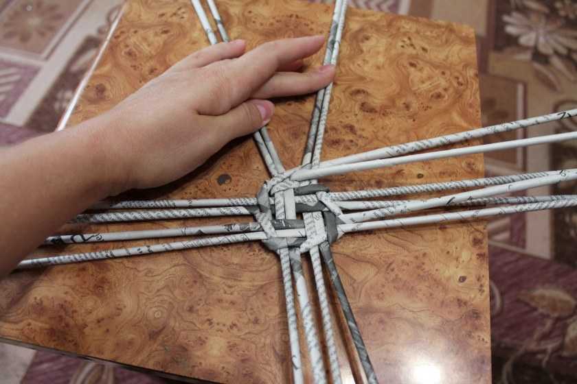 Нужно скрестить друг с другом часть веточек, например через одну. Потом начинаем плести от центра по часовой стрелке, пропуская центральные трубочки поочередно сверху и снизу. Дно можно делать любой геометрической формы.