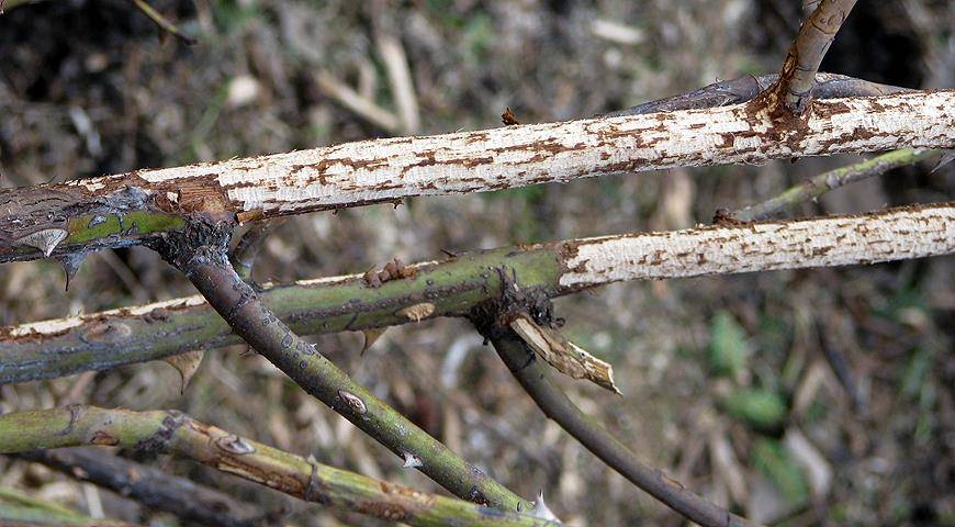 Личный опыт: Побеги розы, поврежденной за зиму мышами. Единственный раз, когда розы плохо вышли после зимы, был в 2010 году. И виноваты были не мороз и не оттепель. Зима была такая снежная и морозная, что мышам было нечего есть, и они в прямом смысле этого слова съели мои розочки, т.е. счистили с побегов всю кору! Розы пришлось обрезать полностью! Но через год у меня уже снова были аккуратные, помолодевшие кусты, а через два я поняла, что такая сильная обрезка несомненно пошла им на пользу.