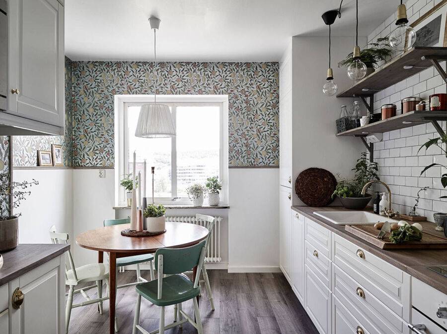 Даже если вы используете обои для декора кухни, то рабочее пространство, чаще всего все равно декорируется именно керамической плиткой, которой не страшны никакие последствия готовки. Небольшое количество плитки, которое приходится тратить на оформление рабочего места, стоит намного дешевле. Такой бюджетный вариант порадует тех, кто не готов тратить на ремонт квартиры слишком большую сумму.