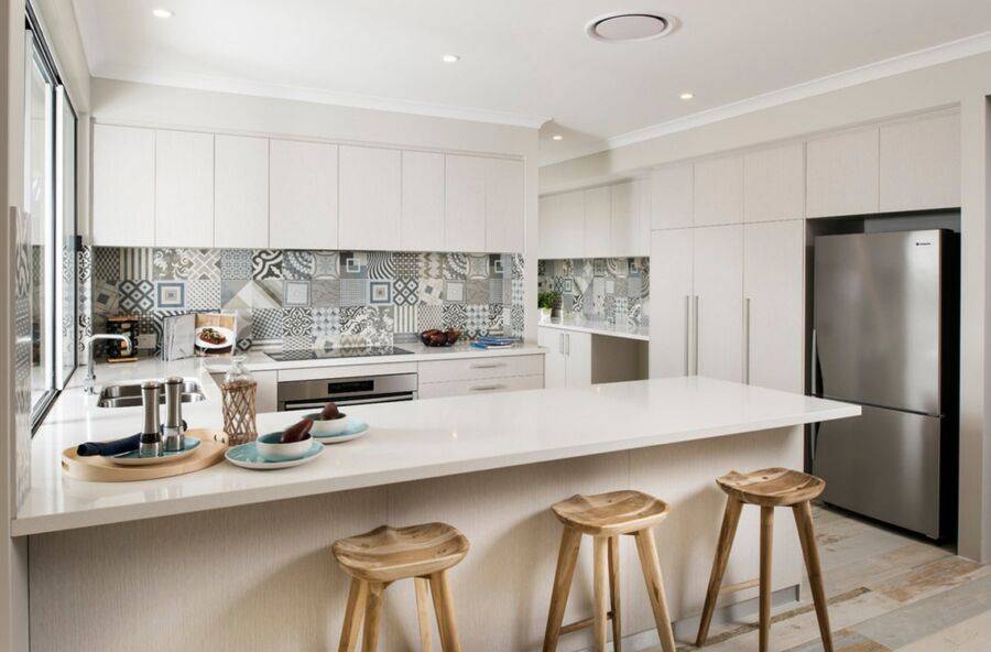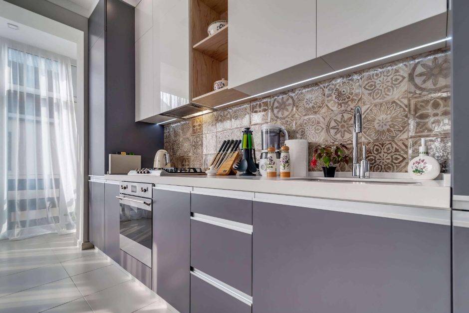 Текстура и узоры на плитках также важны. Кафель с четкими геометрическими узорами можно выбрать для одноцветных кухонных фасадов. Деревянная мебель в сочетании с четкой текстурой плитки, имитирующей, например, бетон, не являются наилучшей комбинацией. Этот тип отделки будет лучше на просторных кухнях в стиле лофт.