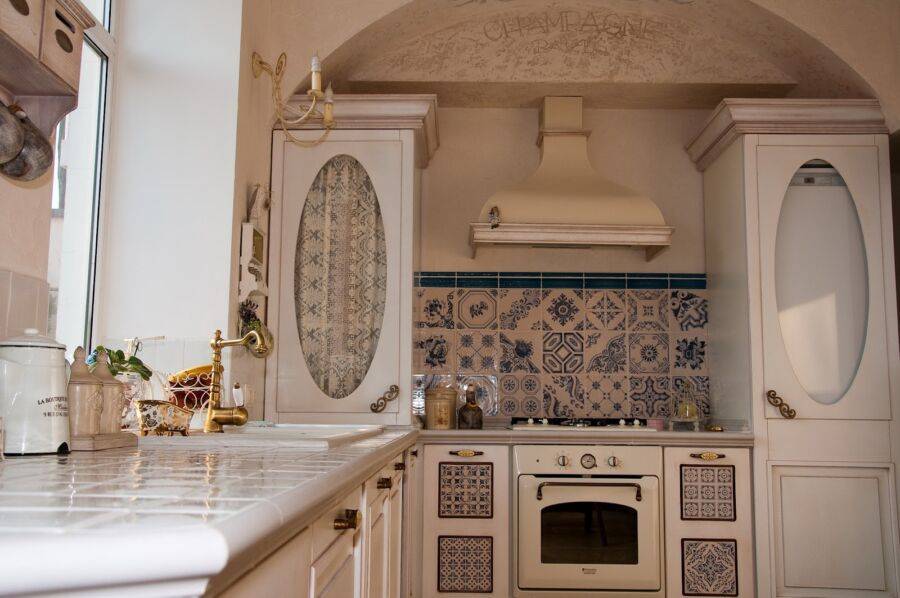 Также важно соответствовать плитке общему стилю. Если кухня выполнена в винтажном стиле, то небольшие квадратные плитки, имитирующие старые изразцовые печи, станут хорошим выбором