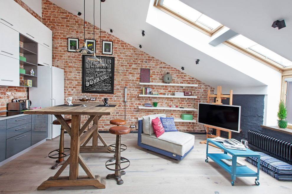 На фото лофт кухня-гостиная на мансарде с деревянным полом, кирпичной отделкой и небрежным декором.