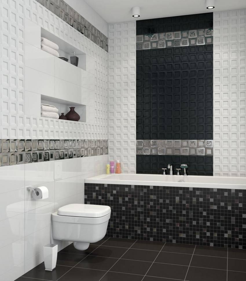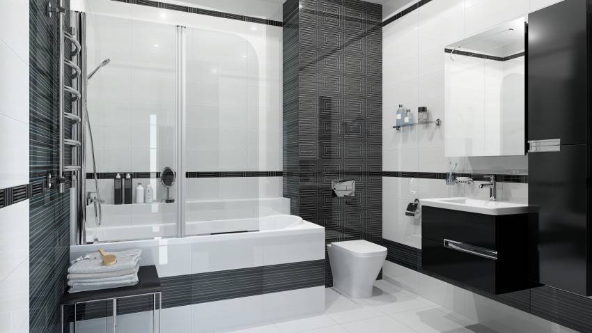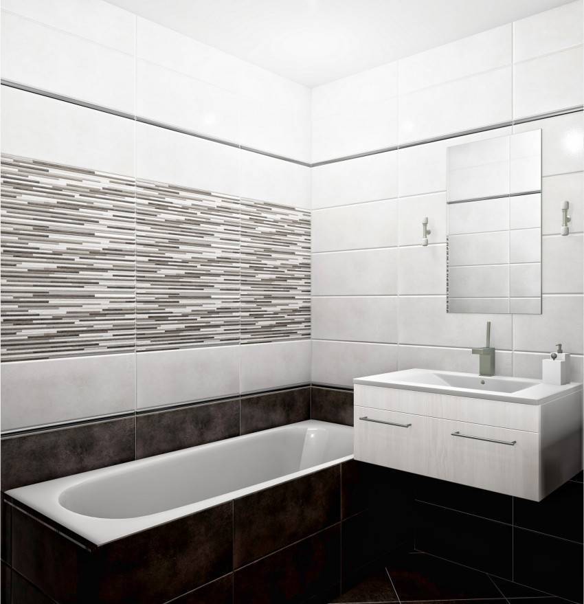 Плитка кабанчик на стенах в ванной – белый фон, черная окантовка.