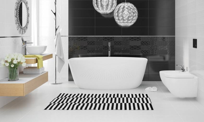 - Черная плитка. Несмотря на то, что черный является классическим цветом, все же он редко используется в качестве основного в интерьерах помещений. Прежде всего это объясняется тем, что черный уменьшает пространство и делает комнату темной, что крайне негативным образом отражается на возможности создания в ней уютной атмосферы. Кроме того, на черном кафеле видны разводы от воды и мыла, поэтому за ним ухаживать достаточно сложно так, как приходиться постоянно следить за его чистотой.