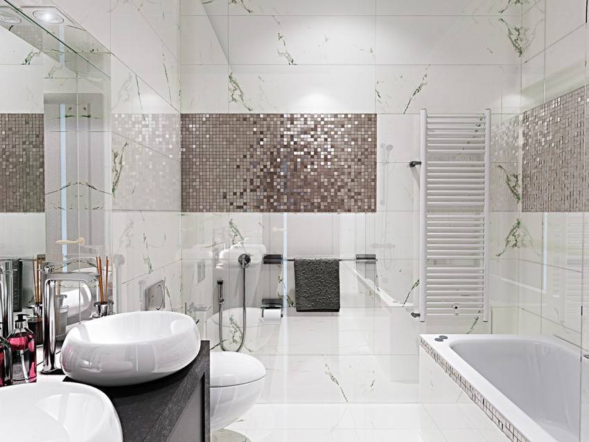 В стену, облицованную плиткой, можно вмонтировать зеркало, споты, декоративное панно. На фото ниже примеры комбинации керамики с зеркальным полотном.