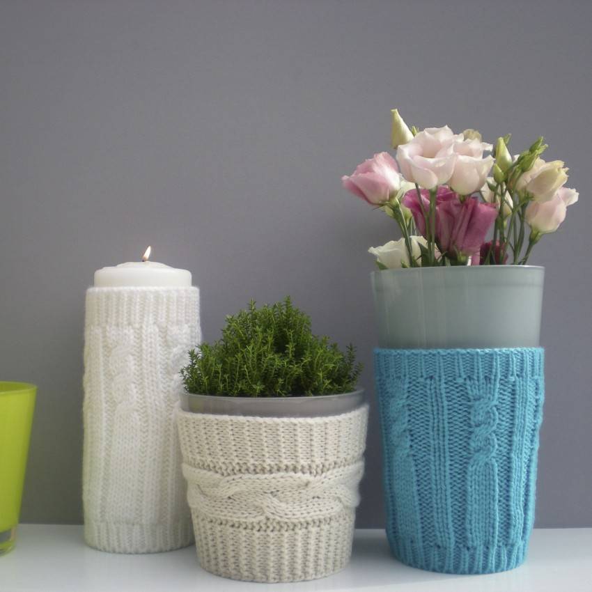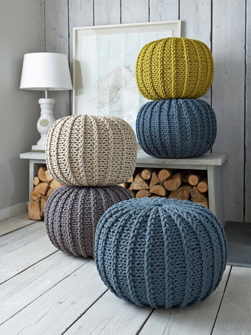 Что касается обвязывания мебели — это не совсем практичный вариант. Такая техника применима в основном для небольших предметов, например, можно обработать круговой вязкой сиденье табурета. А вот для больших элементов лучше оформить вязаные чехлы — их легко снять и почистить, а также можно связать несколько различных по цвету и рисунку моделей. Мебель «переодетая» в тот или иной чехол, в состоянии внести значительные перемены в интерьер комнаты.