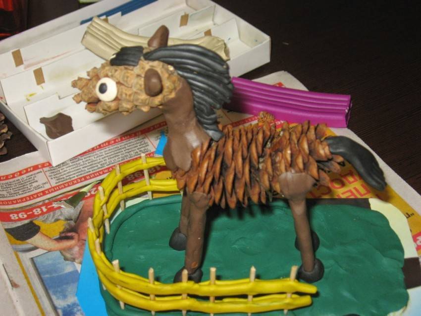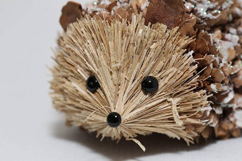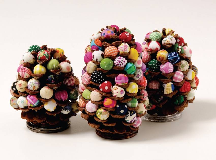 Более крупные конструкции выполняются почти из двух сотен шишек, для прочности скрепляемых друг с другом при помощи проволоки. Здесь все элементы укладывают дном наружу – так конструкция выглядит эстетичнее, аккуратнее, а по причине того, что клей здесь отсутствует, выходит полностью экологичным. Чтобы прикрепить одну шишечку к другой, ее огибают проволочной петлей, а «цепочка» из нескольких предметов замыкается в кольцо.