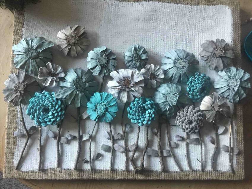 - Если вам достались кривые экземпляры или их наоборот, необходимо изогнуть в определенную сторону, то форму легко скорректировать. Наберите в емкость холодную воду и замочите шишки на ночь. Утром их вынимают из жидкости уже податливыми. В местах, которые необходимо скорректировать шишку перетягивают суровой ниткой и просушивают. Оригинально смотрится миниатюрный бутон, который окружают распустившиеся «лепестки».
