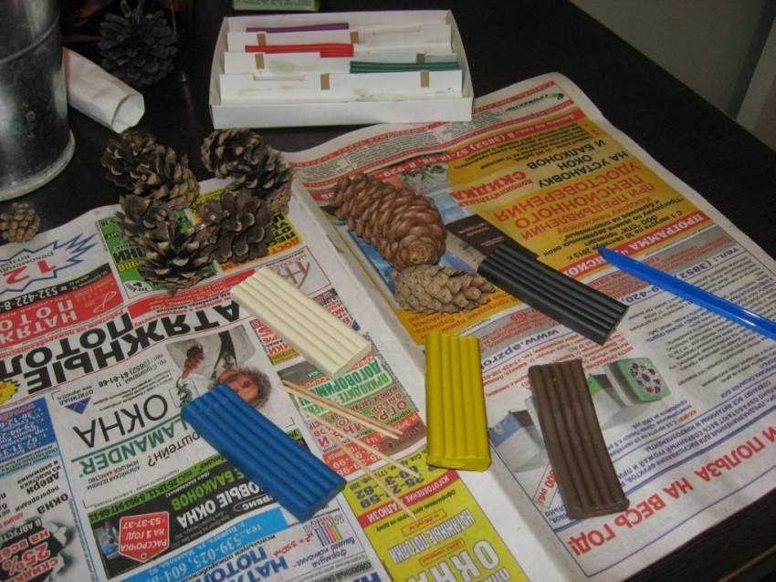 Чтобы результат зимних поделок из шишек радовал глаз и доставлял только удовольствие во время процесса сборки необходимо придерживаться определенных правил подготовки. Вначале собранные составляющие проваривают в течение сорока минут, дальше лишняя влага удаляется одним из методов сушки.