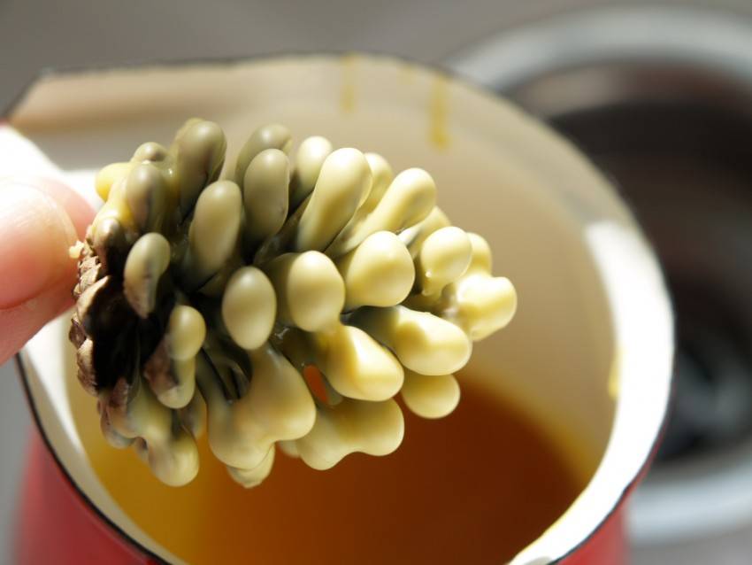 - Чтобы шишки не раскрывались, их вымачивают в столярном клее. После процедуры просушивают. Оригинально смотрятся экземпляры, которые вымочили только наполовину. В результате один бок будет надежно склеен, а второй со временем распустится словно экзотический цветок.