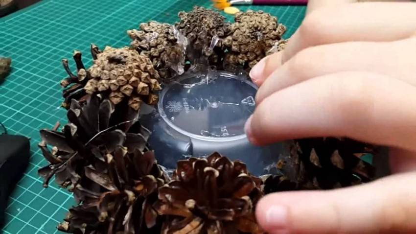- Чтобы сделать дно вазы, соберите такое же кольцо, только меньшего диаметра, вклейте в середину подходящие по размеру шишки и пропустите пересекающийся в центре днища провод.