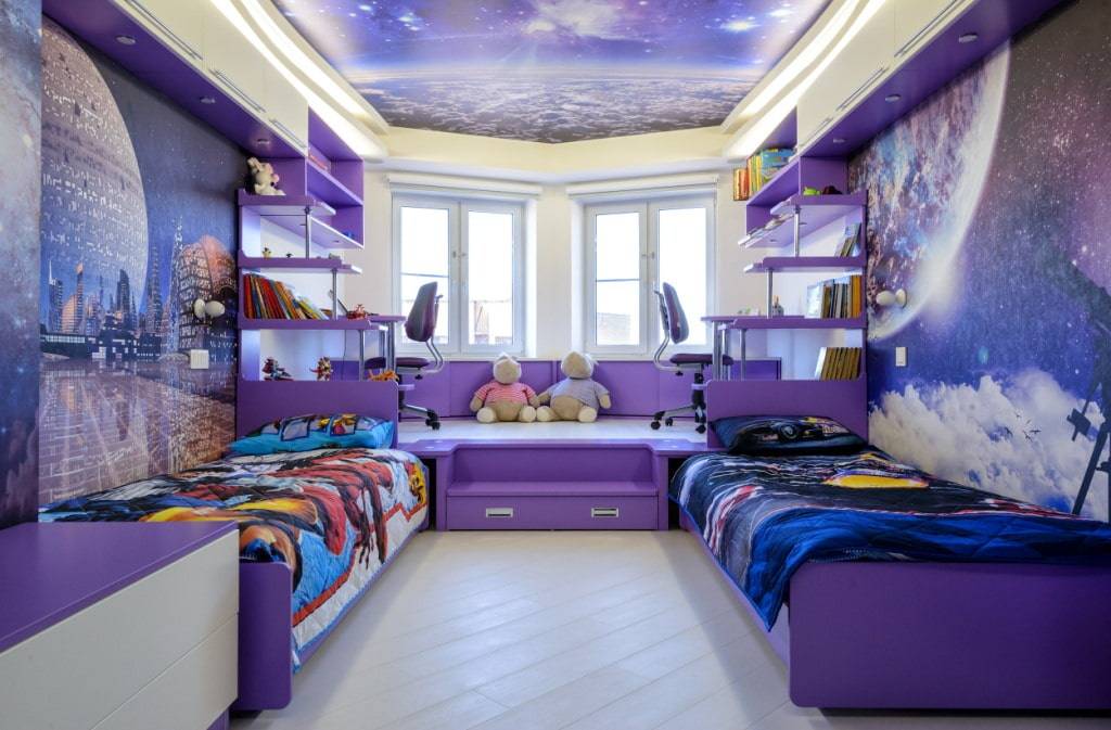 Свободная планировка, зонирование детской спальни с помощью фигурного потолка и мебели