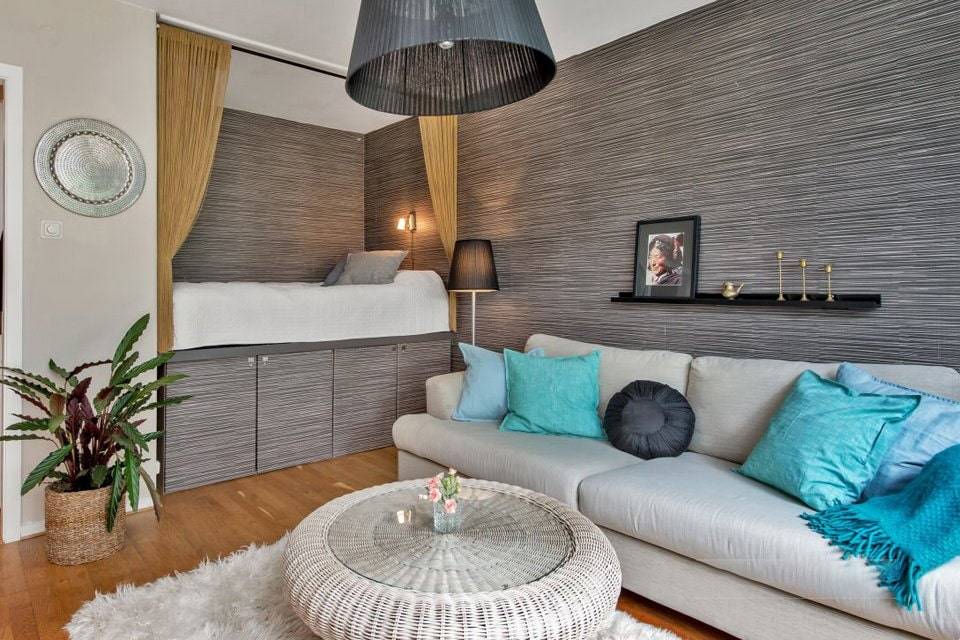 Выкатная кровать незаметна в планировке интерьера маленькой комнаты, декоративные подушки превратят ее в диванчик, подиум зонирует комнату