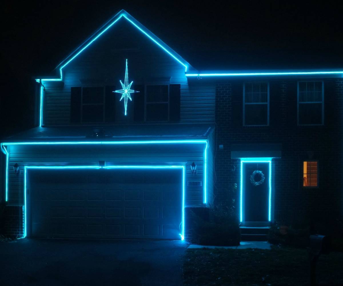 Вот пример того, как декоративное освещение может быть реализовано в одном настроении. Для здания используется контурная подсветка из гирлянд, похожим образом располагаются лампочки и по обе стороны дорожки. Не оставлено без внимания также и дерево, которое также окутано гирляндой.