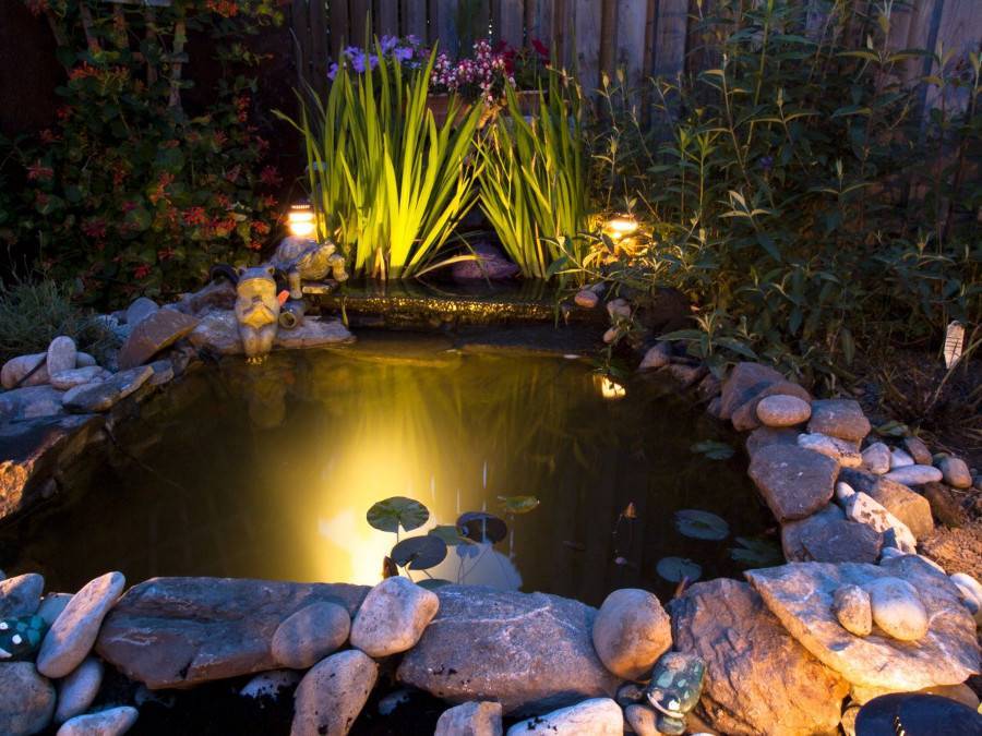 Если на дачном участке есть водоем искусственный или природный, то для него также можно реализовать красивую подсветку. Существуют специальные герметичные светильники, которые устанавливаются прямо под воду. На фото выше видно, каким образом может быть использовано освещение такого типа.