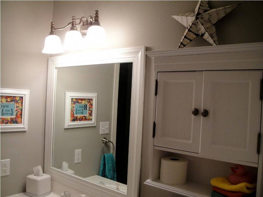 Рама должна быть контрастной по отношению к плитке на стене, но сочетаться с другими цветовыми оттенками декора