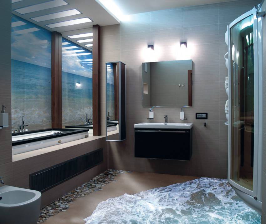 Наливной пол – это еще одно современное покрытие, которое можно использовать для ванной комнаты. Существуют различные типы наливных полов: от выравнивающей стяжки до полимерных полов с 3D рисунком.