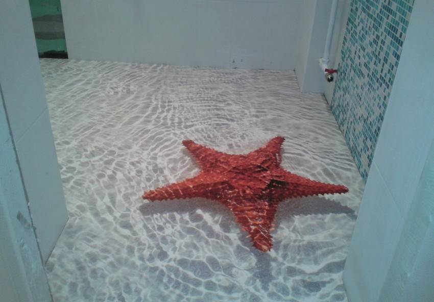 Для оформления нередко используют напечатанные на пленки изображения, которые позволяют получить пол с 3D эффектом. Кроме того, для оформления могут быть применены любые природные материалы – камни, ракушки, песок и пр.