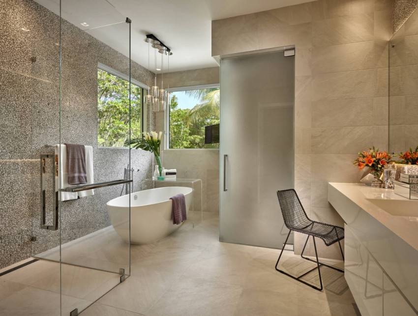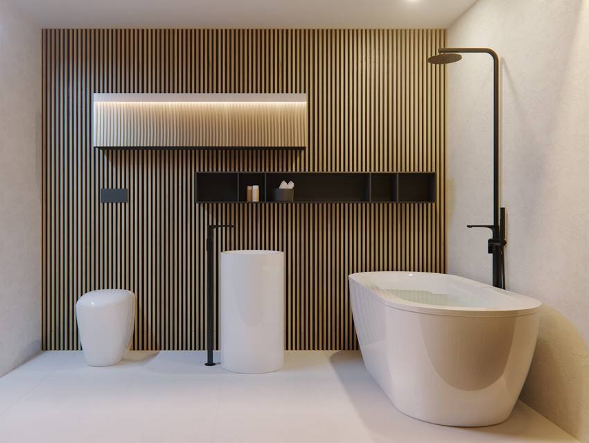 Отделка ванных комнат плиткой одного цвета, но с максимальными фактурными сочетаниями зрительно увеличит пространство