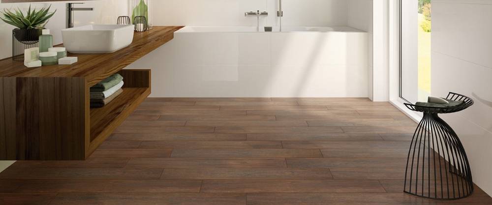 Выбирая плитку под дерево для ванной комнаты, вы выделите гораздо меньший бюджет на отделку комнаты, чем на плитку из натурального сырья. Обратите внимание на сопротивление скольжению выбранной модели и класс износостойкости