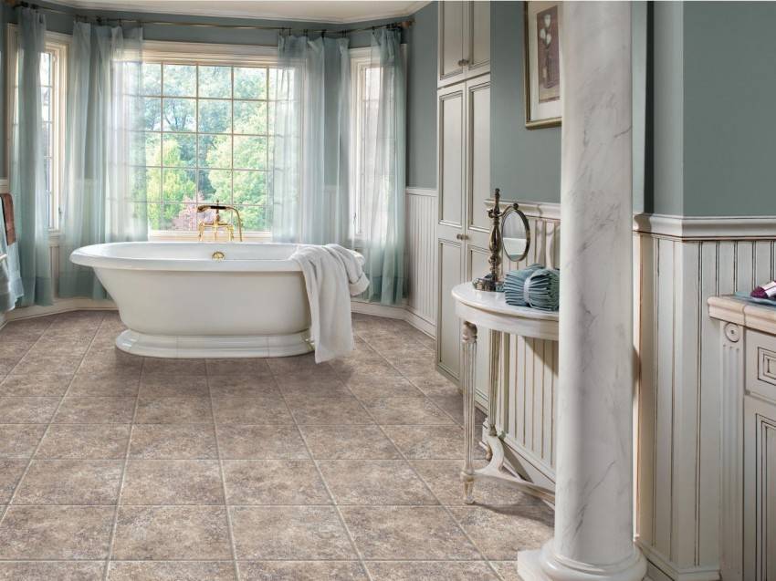 Поверхность линолеума в ванной должна быть рельефной, нескользкой. В уходе линолеум прост, так как не впитывает грязь и влагу. Единственное ограничение – при чистке нельзя использовать абразивы, они повредят поверхность.