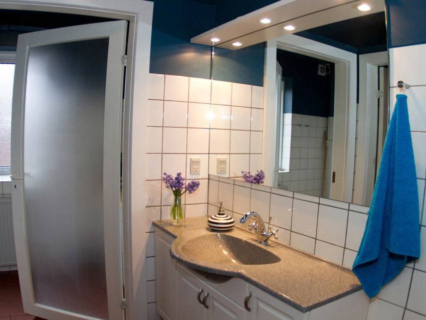 Затем определяют место для мебели. Полки над дверью — удачный способ использовать пространство. Вместо напольных шкафов лучше повесить малогабаритные настенные полки и шкафчики. Короба из гипсокартона закроют трубы и коммуникации. Это хорошая возможность сделать дополнительные ниши для хранения косметических принадлежностей.