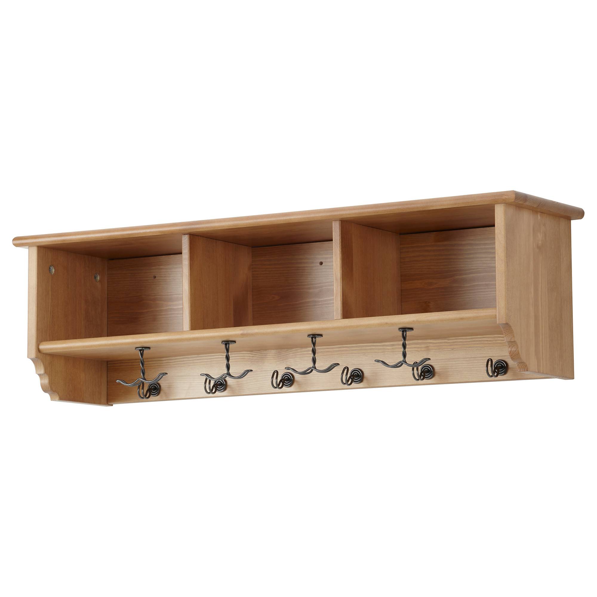 Натуральное дерево — полностью экологичный материал. При производстве мебели обычно используются твёрдые породы: дуб, вишня, ясень. Навесные полки для прихожей из натуральной древесины, как на фото — массивные, толстые, крепкие, прочные. Деревянные конструкции органично вписываются в любой интерьер, но есть у них и недостатки: высокая цена, боязнь влаги, огня, механических повреждений, требовательность в уходе. При желании дерево можно обработать, покрыть специальными пропитками, покрасить краской какого угодно цвета.