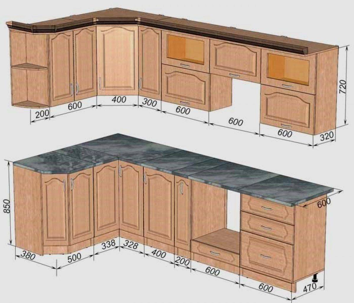 В кухнях при проектировании гарнитура используются три вида угловых кухонных шкафов-тумб. Приведу типовые схемы и чертежи конструкции. Она может изменяться в большую и меньшую сторону. При уменьшении в обязательном порядке учитывается ширина получаемого на выходе фасада – от этого зависит доступ к внутреннему пространству шкафа.