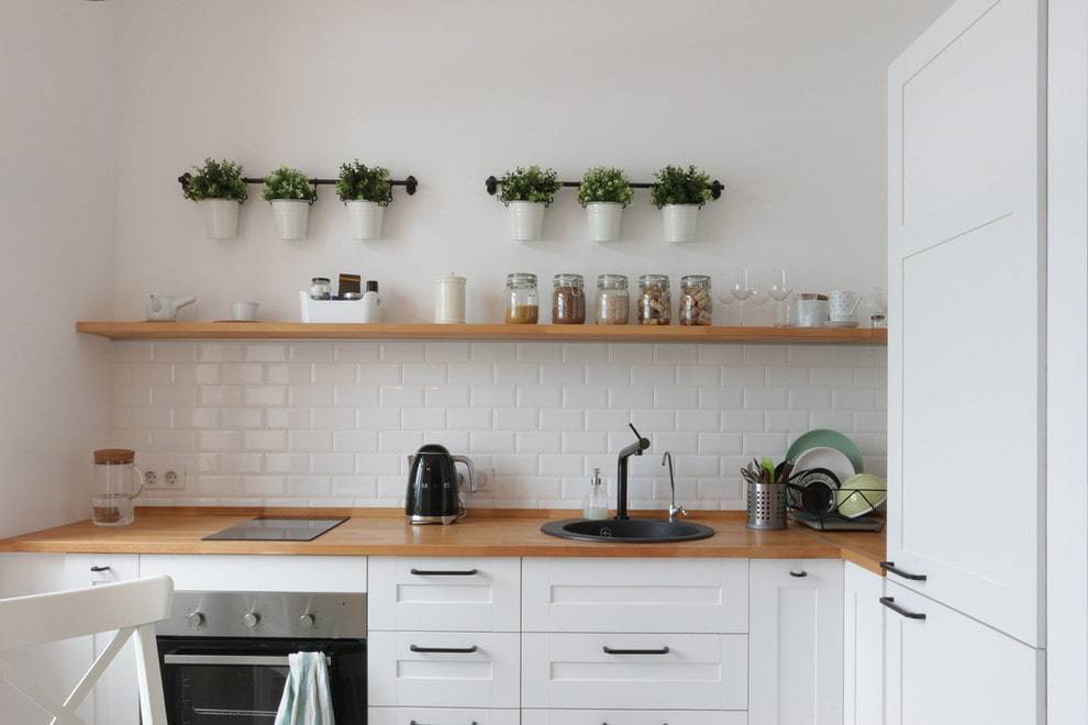 Такие декоративные элементы вешаются на противоположной стене от рабочей зоны. Также используются угловые или подвесные полки. Устанавливаются у фартука или в противоположном углу.