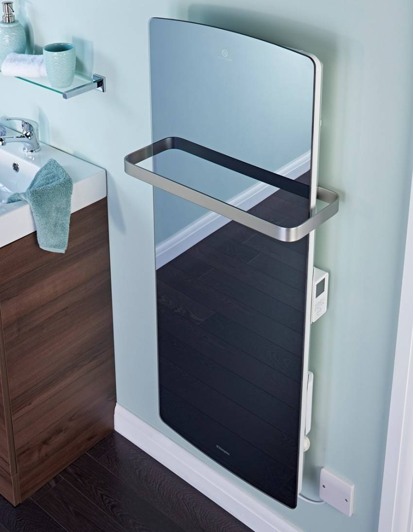 Современный полотенцесушитель — это не всегда известная «змея», как может показаться, а элегантный стеклянный экран с отверстиями для полотенец. Стоит ли говорить о том, как стеклянная конструкция с подогревом в ванной комнате выглядит оригинально и нежно? Само стекло может быть прозрачным, а также матовым или даже цветным. Рассмотрите такой вариант для своей ванной комнаты.