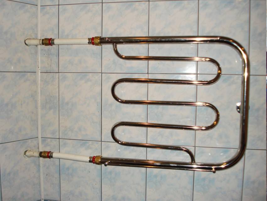 Такой полотенцесушитель представляет собой змеевики, по которым проходит горячая вода. Чаще такой змеевик подключается к горячей водопроводной трубе, т.к. отопление в нашей стране сезонно отключается на срок от трех месяцев до полугода. Поэтому, если завести сушилку на отопительную систему, в теплое время года она работать не будет.