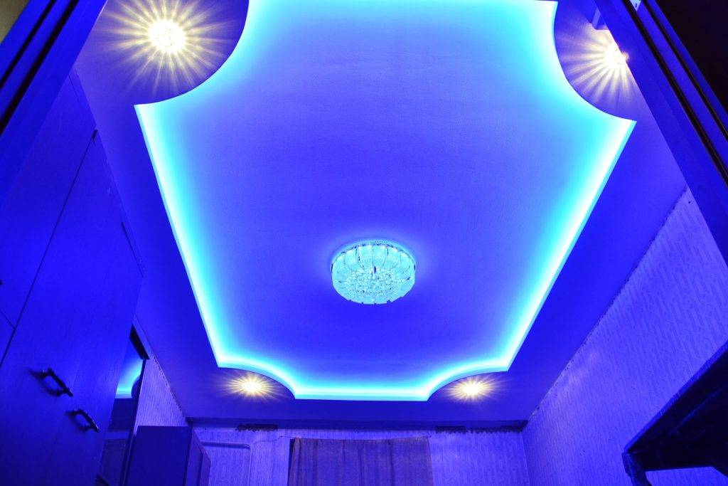 - двухуровневые конструкции позволяют организовать сложное освещение, гармонично сочетая локальную подсветку отдельных зон с общим световым контуром, а также хорошо смотрятся гипсокартонные потолки с подсветкой и установленной люстрой;