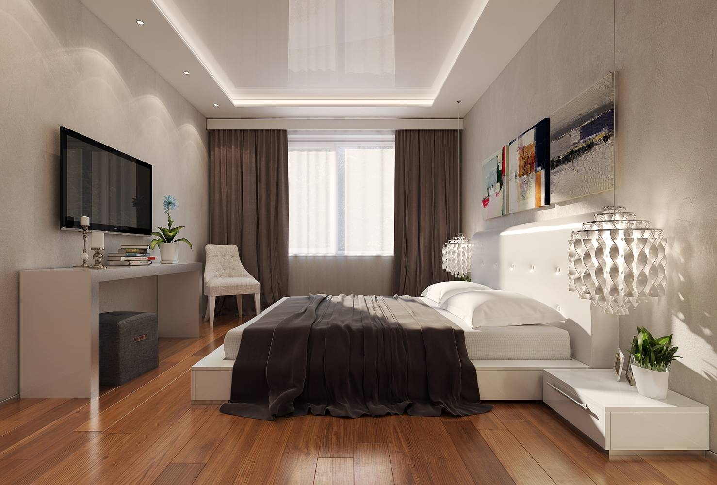 Интерьер спальни с натяжным потолкомИсточник potolki.panorama-okno.ru