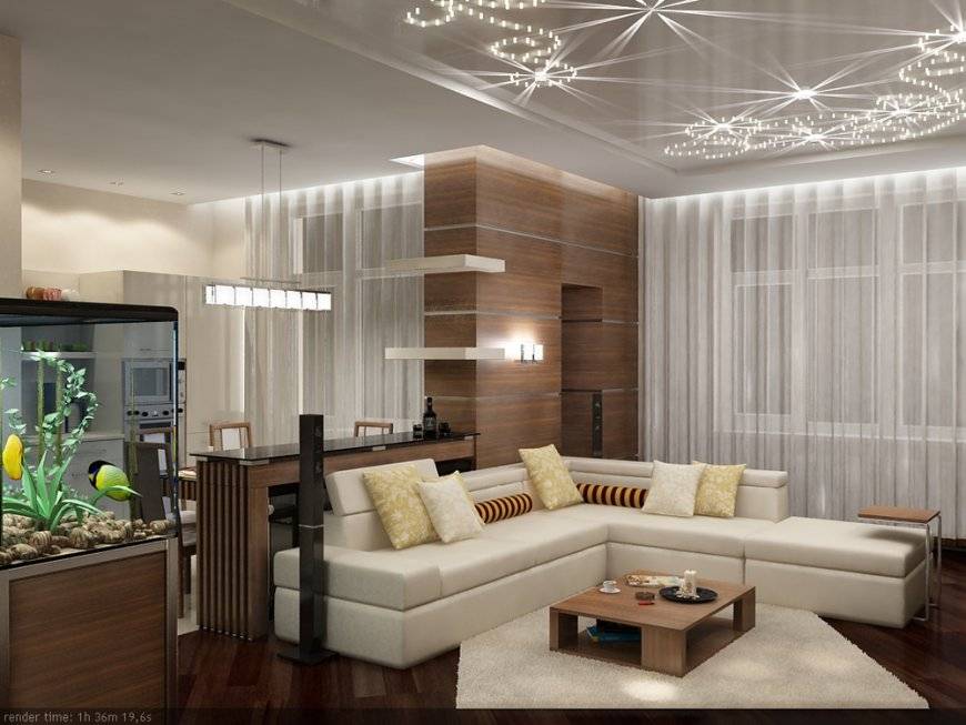 Определившись с общим настроением гостиной и переходя к оформлению потолка, примите во внимание некоторые правила: