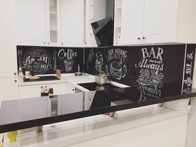 Очень оригинальный метод — вместо фартука делать грифельную доску. Все, что для этого потребуется — три раза пройтись грифельной краской по необходимому пространству. За ней легко ухаживать: избегать абразивные моющие средства и жесткие губки.