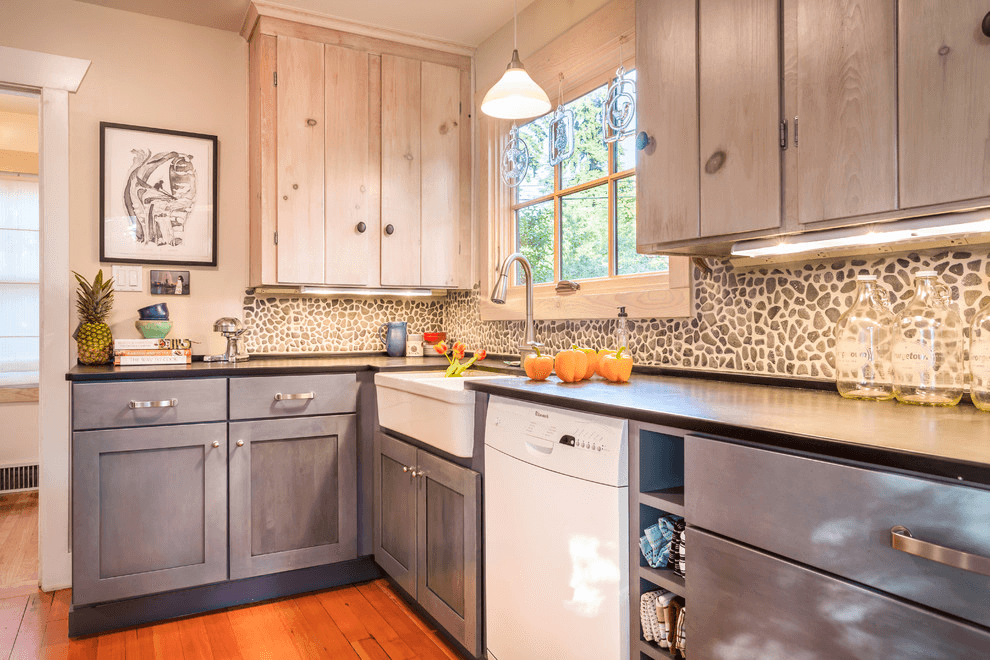 Если вы любитель галечных пляжей, то можно создать такой уголок и на кухне. Например, в виде фартука. Но поскольку поверхность камня неоднородная, но вычистить его будет очень непросто, пыль будет попадать между камешков, и в итоге такое панно быстро потеряет первоначальный вид.