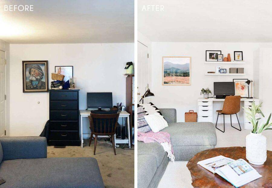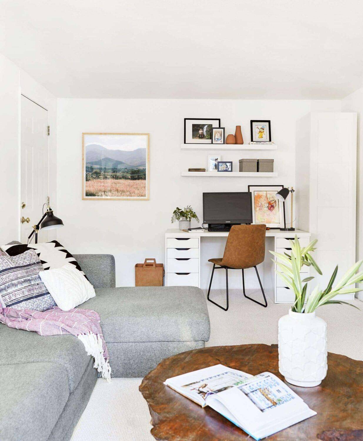 На фото интерьер небольшой гостиной в белом цвете с рабочим местом у окна.