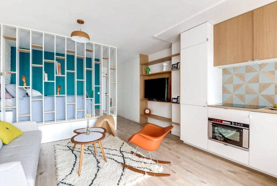 ФОТО: static.tildacdn.comСпрячьте двери в стене, чтобы не создавать лишних линий и сочетаний цветов