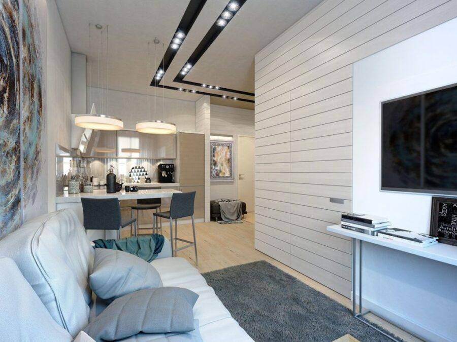 Соедините вместе три функциональные зоны – кухню, столовую и гостиную. На кухне установите встроенную мебель и бытовую технику, освободите все поверхности. Отделить кухню от гостиной можно с помощью барной стойки, которая послужит обеденной зоной в малогабаритной квартире.