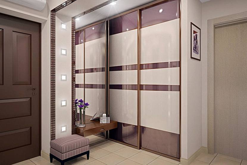 В зеркальных шкафах вдоль всей стены вместится все, при этом изначально кажется, что это и не шкафы вовсе. Не очень светлая прихожая, но практичность ее оформления – на самом высшем уровне.