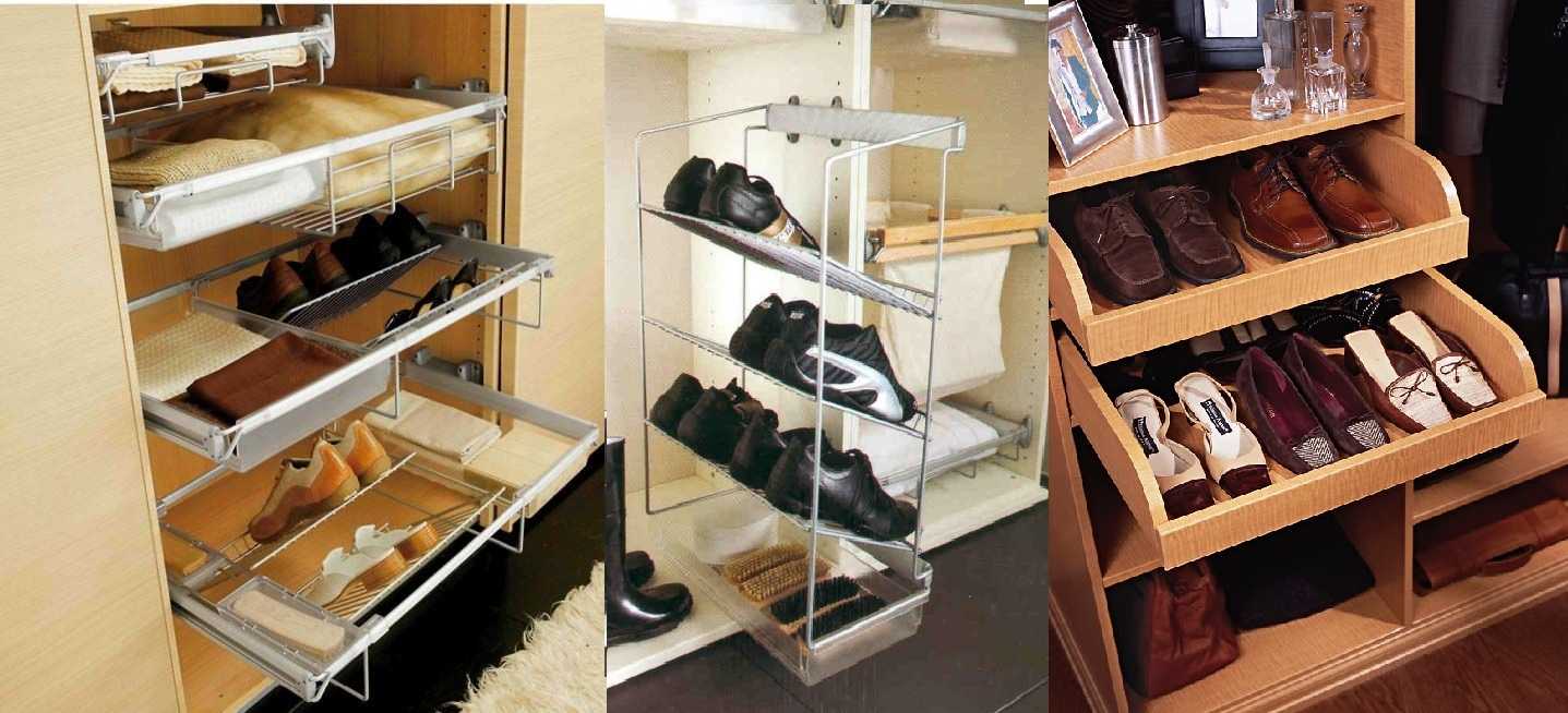 Под обувь отводится нижняя часть шкафа купе. Для хранения обуви удобнее устанавливать не полки из ЛДСП, а сетчатые. Во-первых у таких полок лучше «просматриваемость», во-вторых на них не скапливается пыль и грязь, в-третьих, удобно ставить обувь на каблуках.