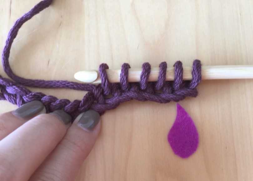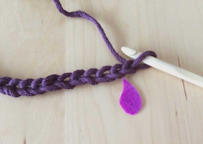 Листочек вяжем по схеме, а «хвостик» делаем из пары строчек простых петель, связанных между собой.