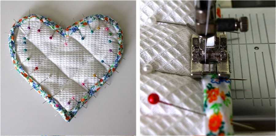 После того, как все составляющие совмещены нужным образом, закрепите их сметочным швом, а затем прострочите на машинке. Если вы прошиваете прихватку изнутри, то не строчите все полностью, а оставьте место, где будете выворачивать изделие наружу.