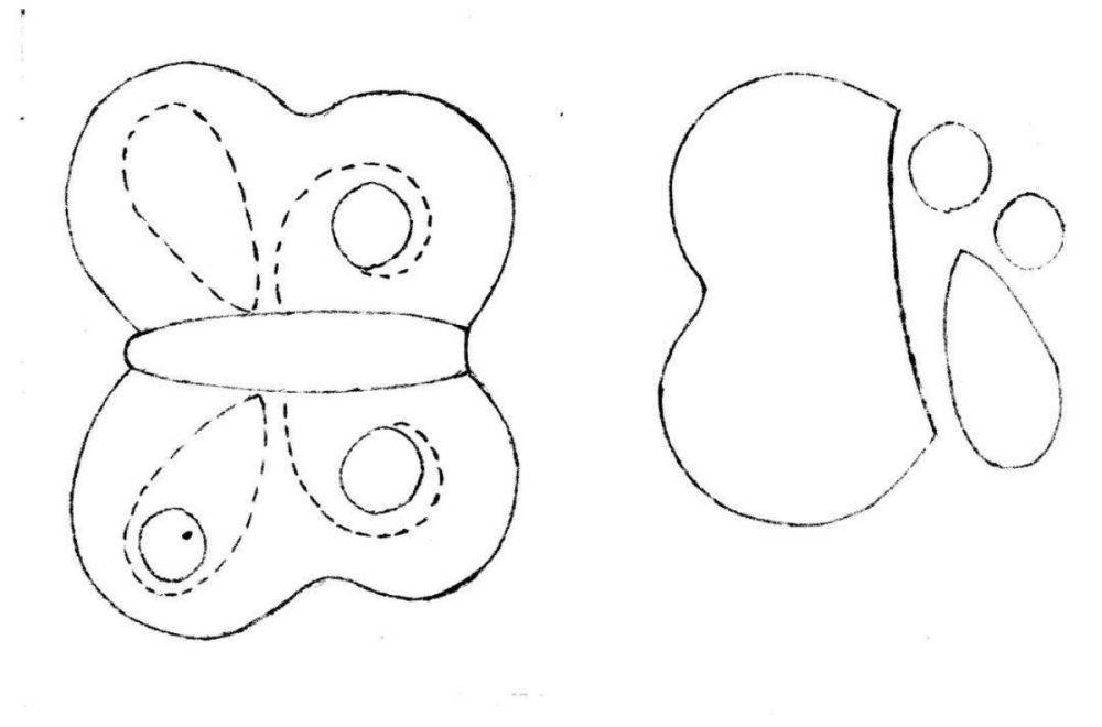 Рисунок переносится на ткань и аккуратно прорисовывается. Деталей основной ткани и наполнителя должно быть по две. Таким образом, всего выходит четыре основных элемента. Они должны быть одинаковыми и с дополнительным припуском 0,7-1 мм по краям для припусков!