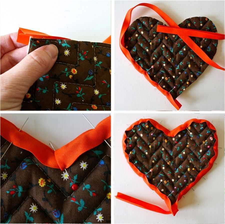 Вывернув изделие, аккуратно выровнять его форму, помогая карандашом или ручкой. Несшитые края подвернуть внутрь, вставить ленточку для подвески и прошить декоративным швом, продолжив его по всему периметру изделия. Даже самый простой шов будет выглядеть стильно, если выдержан его шаг, расстояние от края изделия везде одинаково. Немного набив руку на простейшем дизайне, можно перейти к более сложной технике пошива без швейной машинки – пэчворк.